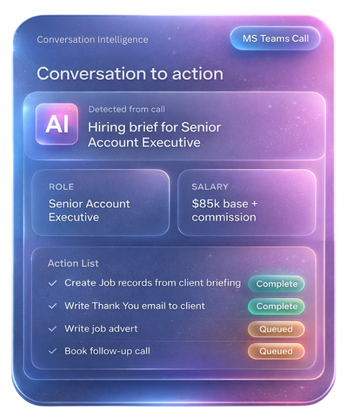 Just one conversation that instantly becomes organised data, actions, and outcomes.
